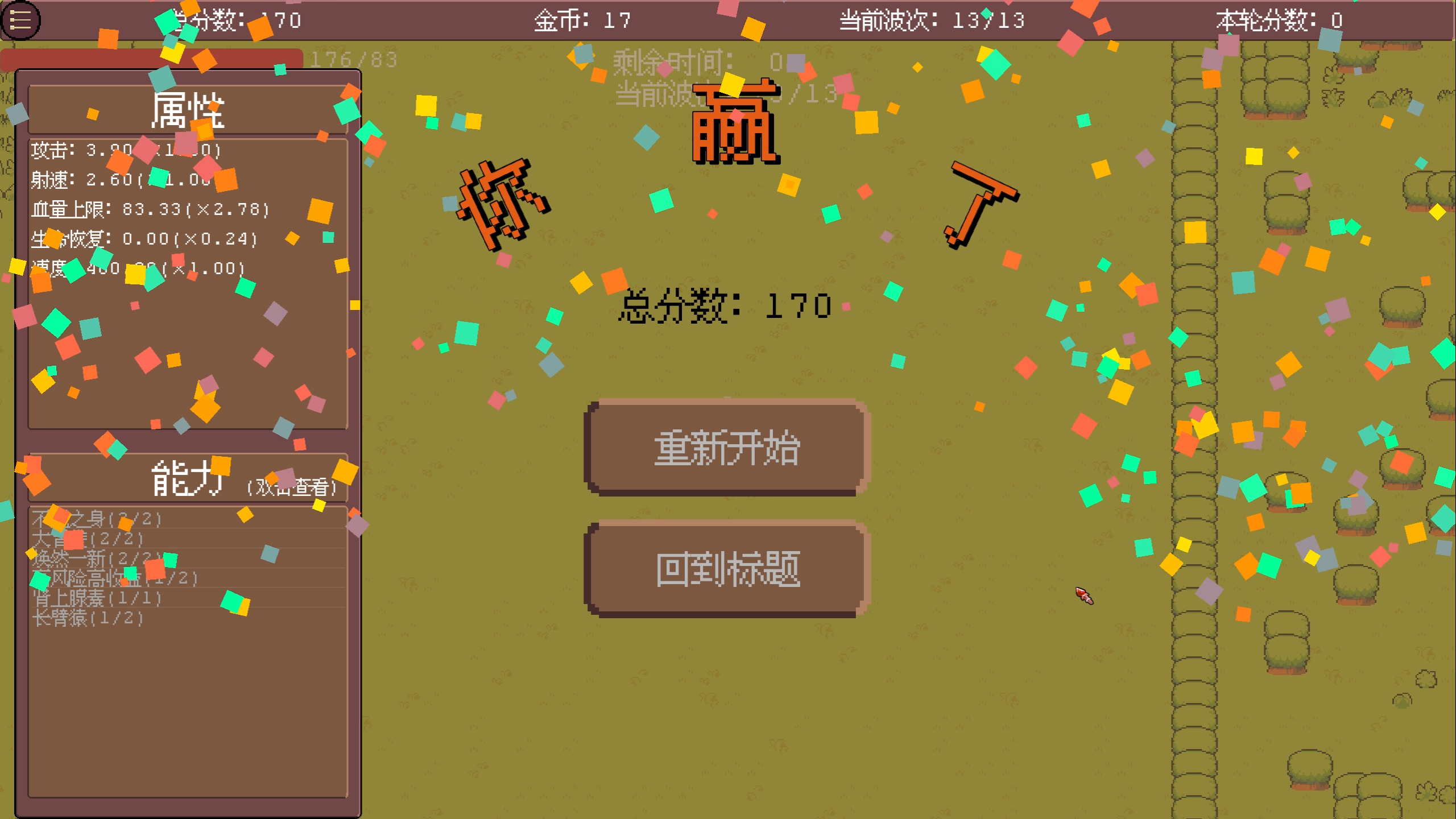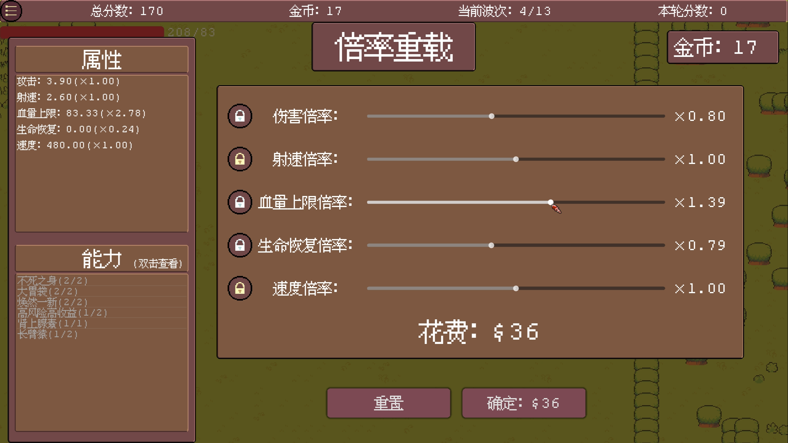 在游戏中,玩家需要撑过敌人13个回合的进攻,每回合战斗后,玩家都可以提升属性与获得能力,每4回合玩家可以进入商店或大幅调整属性的倍率。随着回合数增大,敌人会快速变强,为了获得游戏胜利,玩家必须合理地选择能力进行配合,并根据配合提升特定属性的值。